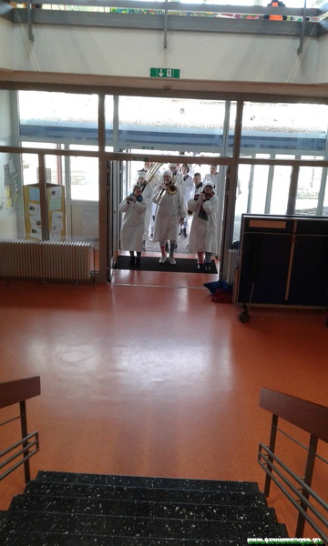 Schülern in den Schulhof, wo wir dann die Schüler-Narrenfahne histen.
