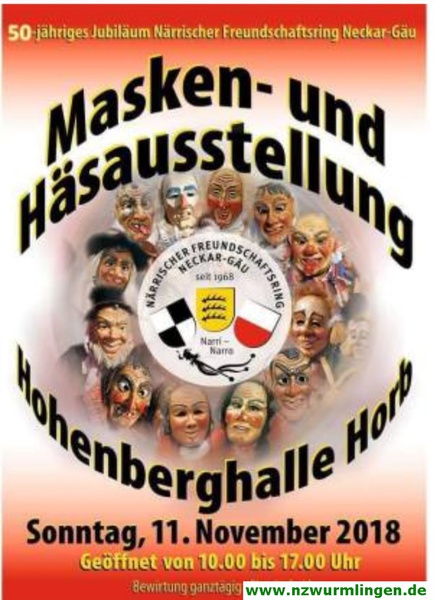 Der Närrische Freundschafts-Ring-Neckar-Gäu feiert dieses Jahr sein 50-jähriges Jubiläum. Auch für uns in unserem 40-jährigen Jubiläumsjahr eine tolle Sache und wir sind seit dem Jahre 1980 Mitglied im Närrischen Freundschaftsring. Anlässlich des Ring-Geburtstages gab es in der Hohenberghalle in Horb eine Ausstellung aller 26 Ringzünfte. Los gings am 10.11. mit einem internen Festakt und am Sonntag öffnete die Ausstellung dann ihre Tore für die Außenwelt.