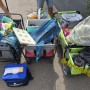 Essen, Snacks und Getränken gefüllt, dass einer noch fast zwei seiner Räder verloren hat.